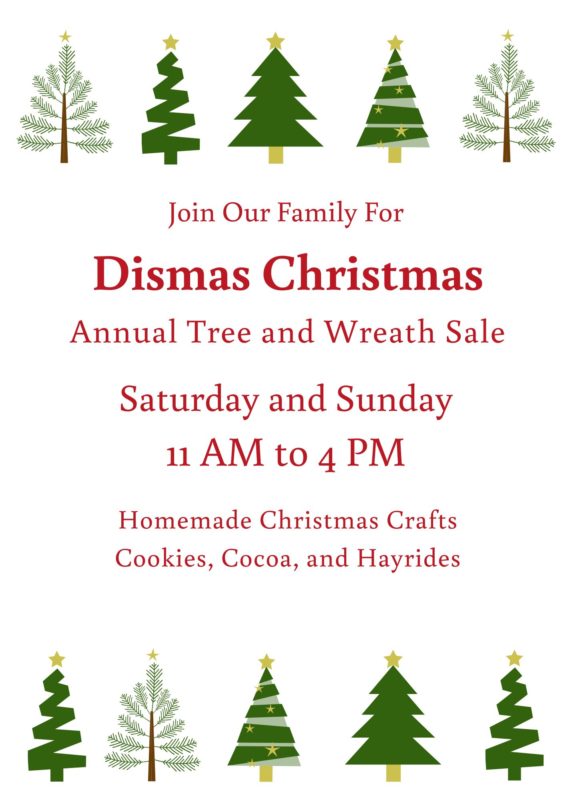 Join us for holiday cheer and support Dismas at our seventh annual Dismas Christmas! Saturdays and Sundays, November 29th and 30th, and December 6th and 7th, at the Dismas Family Farm! Click HERE for more information!